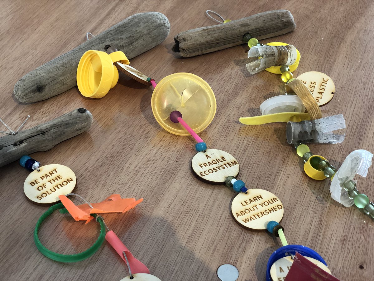 I proposed two activities to the group of docents. The first one, make a mini mobile with lasered wooden tags and pieces of trash collected around the