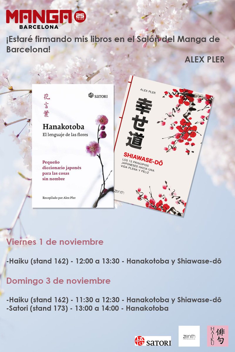 #MangaBarcelona tendremos a@AlexPler_, librero de Haiku, firmando sus libros#Hanakotoba (@satorilibros) y#Shiawasedô (ed. Zenith de@Planetadelibros) mañana viernes 1 (de 12:00 a 13:30) y también el domingo 3 (de 11:30 a 12:30).pic.twitter.com/wE63HBGD0X
