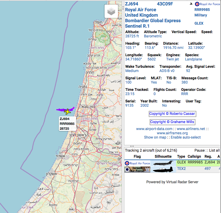 #RAF Bombardier Sentinel R.1 – off coast of#Israel, possibly on a#OperationShader mission ZJ694#43C09F Callsign: RRR9985#AvGeek#ASTOR#SIGINT pic.twitter.com/UYlNgampBP