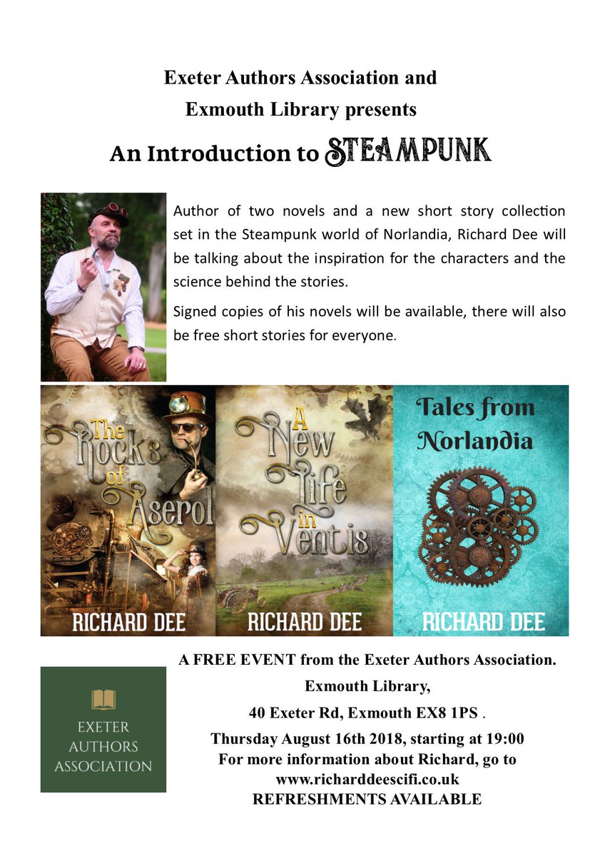 #steampunk@ExmouthLibrary with Richard Dee. August 16th at 7 p.m. Talking#worldbuilding and#characters with#free#samples and#signed novels pic.twitter.com/84KK1Ij5Oi