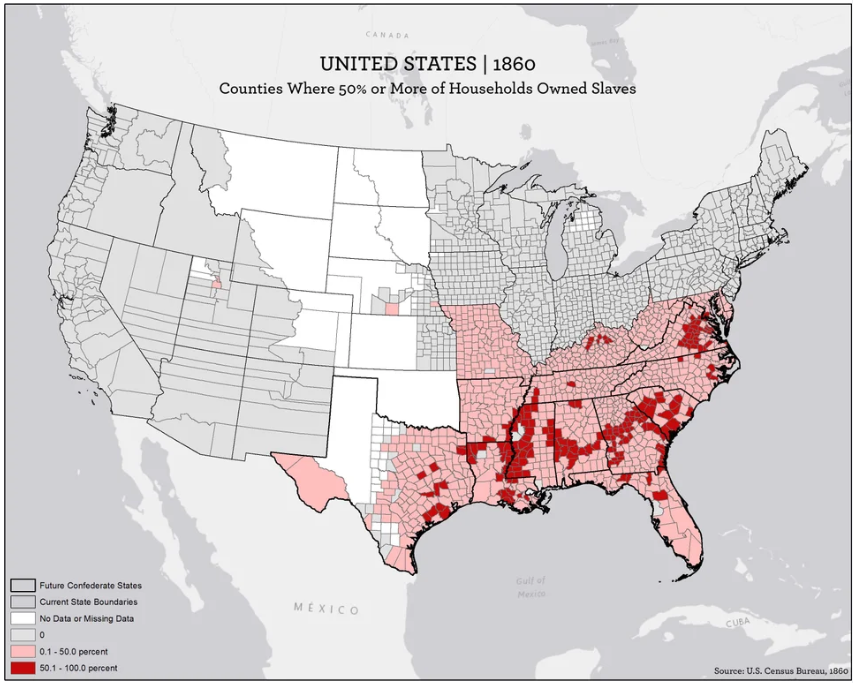 Counties where 50% or more of households owned slaves. Pink: 0.1-50% Red: 50.1-100% Source: US Census 1860