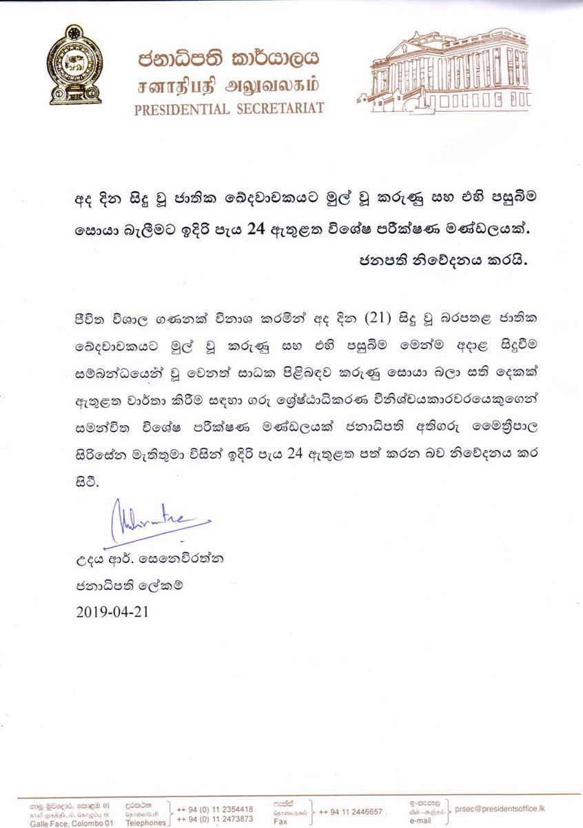 Special statement issued by the Presidential Secretariat regarding blasts and curfew