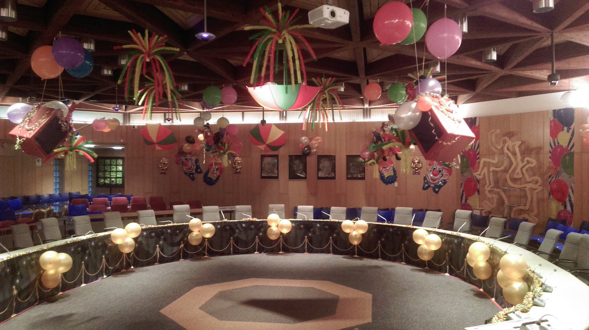 Raadzaal in De Steeg is nu nog leeg maar wél versierd!En om 20.11 uur barst hier het carnaval los