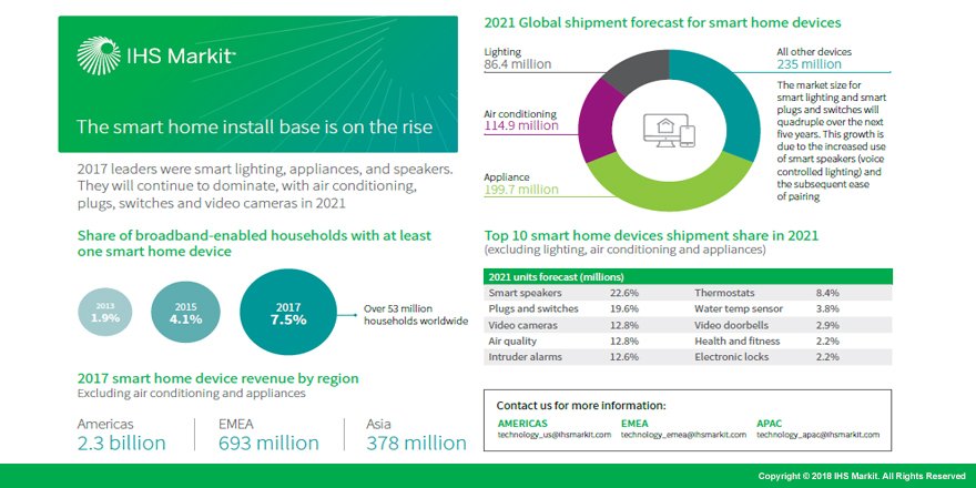 #smarthome install base is on the rise. 2017 leaders were#SmartLighting,#SmartAppliances &#SmartSpeakers. They will continue to dominate, with air conditioning, plugs, switches & video cameras in 2021. View infographic.#CES2018#IHSMarkit4CES http://ihsmark.it/e8OU30hHhUj pic.twitter.com/2ax36OBLmJ