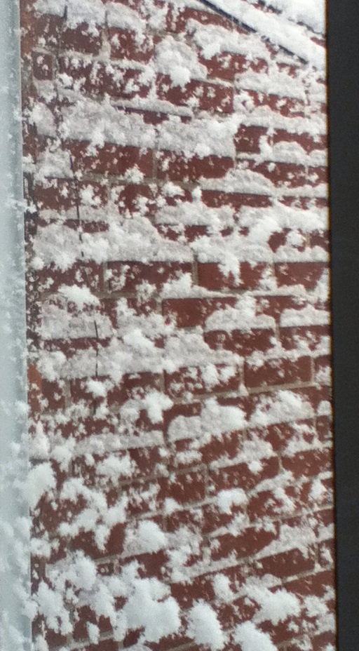 Snow embellishing a plain brick wall..