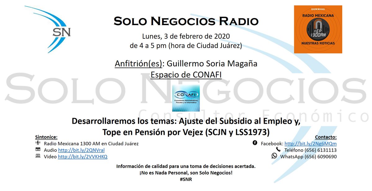 [SNR] Solo Negocios Radio 03/02/20 de 4 a 5 pm (Cd. Juárez); con el tema Ajuste del Subsidio al Empleo y Tope en Pensión por Vejez. * Radio Mexicana 1300 AM * Audio http://ow.ly/utna50ycuM6 * Video http://ow.ly/opaw50ycuM7 ¡No es Nada Personal, son Solo Negocios!