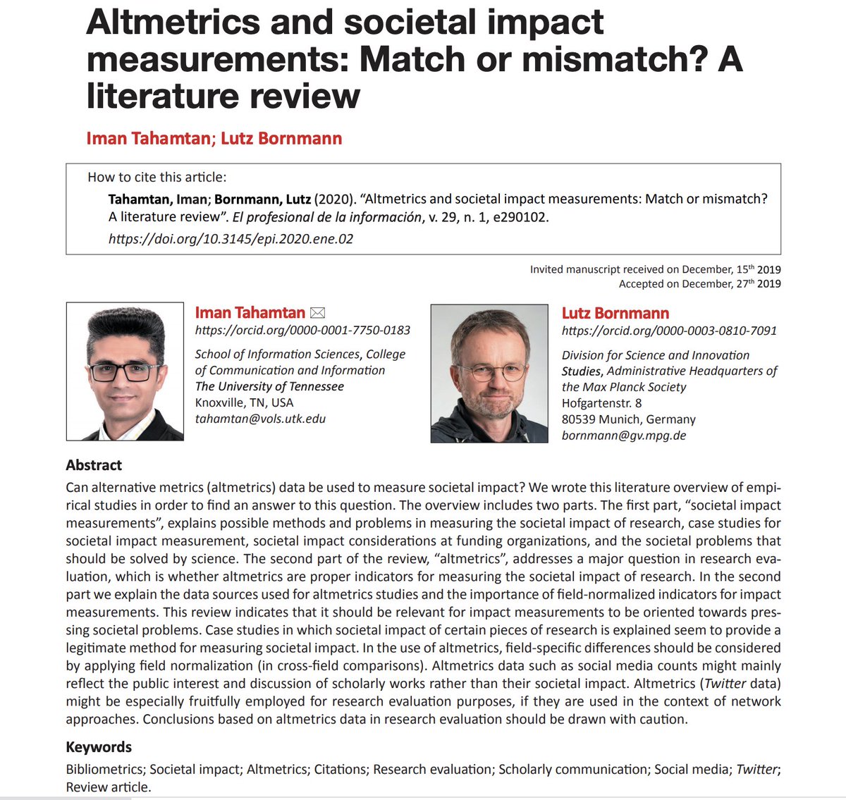 @lutzbornmann and I wrote a literature overview of empirical studies in order to find an answer to this question: Can alternative metrics (#altmetrics) data be used to measure#societal#impact? http://www.elprofesionaldelainformacion.com/contenidos/2020/ene/tahamtan-bornmann.pdf …pic.twitter.com/orzoIwoWZM