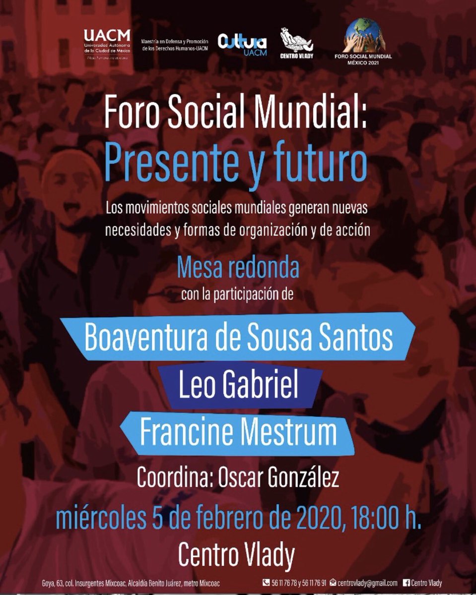 #WorldSocialForum is being planned in#Mexico, for 2021. The future of the forum will be debated there next week, with Boaventura Santos, Francine Mestrum and Leo Gabriel. Is another forum possible?@FMestrum#forosocialmundial#fsm2021#socialmovements pic.twitter.com/OnYkc9D9fU