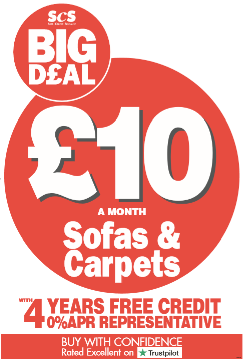 @scssofas you can get a brand new#sofa or#carpet for just ten pounds a month! Check out the County sofa now only £488 – that’s less than half price and yours for £10 a month, with 4 years free credit*!pic.twitter.com/THed0pNNCr