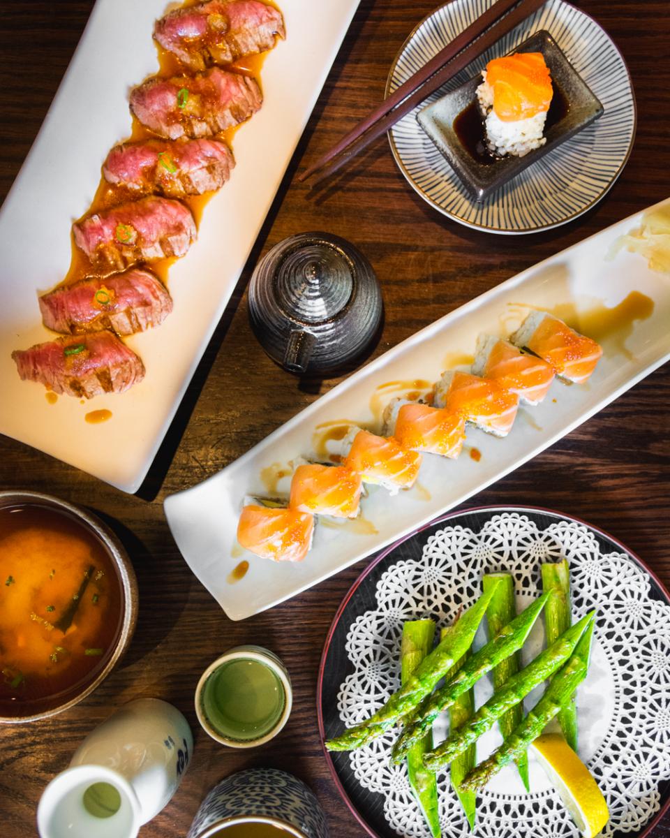 Dynamite roll (eel and seaweed), Sakura roll (kani salad and masago), and Oyster roll