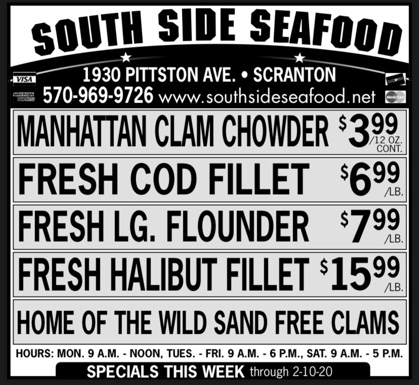 SPECIALS!!! Through 2/10 the specials include: Manhattan clam chowder, fresh cod fillet, fresh lg flounder, and fresh halibut fillet.