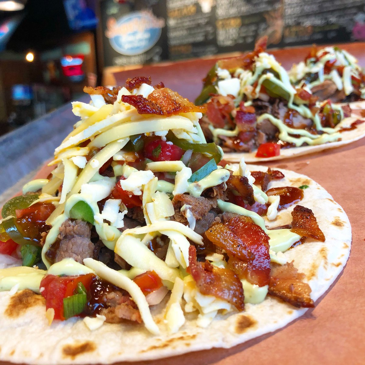 JUAN, 2, 3 BRISKET TACOS... Smoked brisket tacos, pepperjack, Gouda, Muenster cheese blend, heirloom tomato pico de Gallo, bacon, Candied jalapeños, spicy Juan Carlos bbq sauce, avocado sauce!