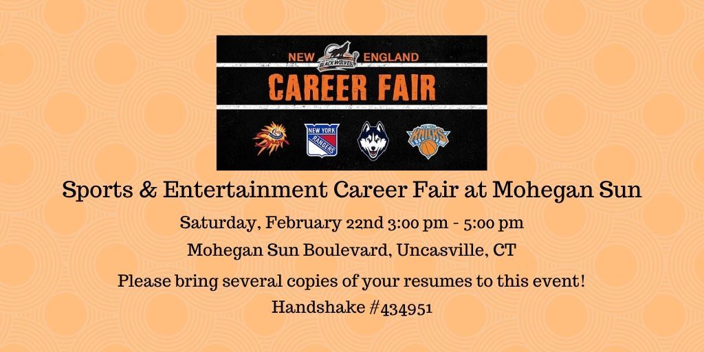 Sports & Entertainment Career Fair at Mohegan Sun Saturday, February 22nd, 2020 3:00 pm - 5:00 pm Come meet Connecticut's finest sports organizations! https://buff.ly/37HA97M