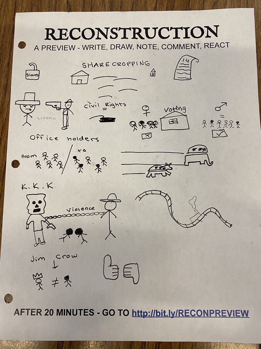 Love starting a new unknown topic with various sources to preview, Ss jot sketch write comment for 20 min, then come to class with 1 Q, 1 Comment, and 1 word - good opener to activate prior knowledge without any prior knowledge!
