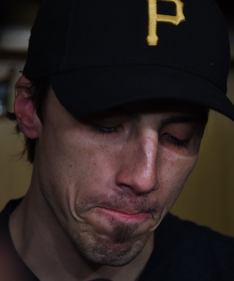 Penguins Marc-Andre Fleury holds back tears while talking to the media today at PPG Paints Arena