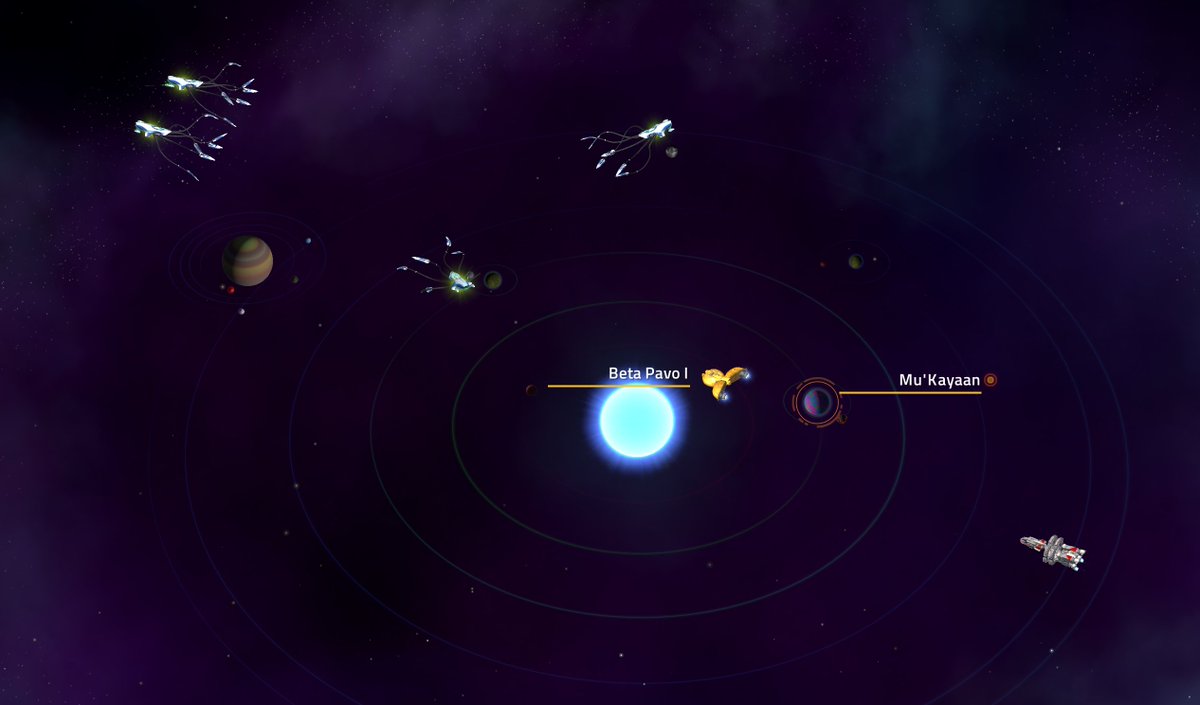 This star system has a green main sequence star, a white dwarf and a brown dwarf in it. Each star has its own system of worlds. There’s a pair of pre-hyperspace civs in a race to colonize the planets here. You can meddle or continue on with you other missions,