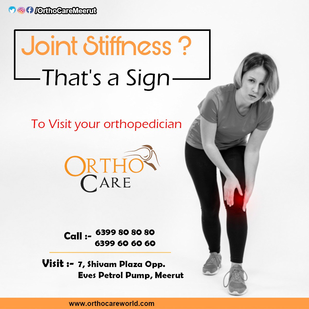 @OrthocareMeerut#Joint#stiffness may be either the symptom of#pain on moving a joint, the symptom of loss of range of motion or the#physical sign of reduced range of motion Visit: 7, Shivam Plaza Opp. Eves Petrol Pump,#Meerut Call: 6399 80 80 80pic.twitter.com/r8RbPUyisI