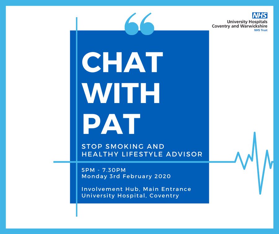 Chat with Pat! Our Stop Smoking Healthy Lifestyle Advisor. Tonight 5pm - 7:30pm. Involvement Hub, Main Entrance University Hospital, Coventry. Start the journey to becoming smoke free, pop in for a chat tonight. See you there! http://ow.ly/hbeE50yc4bt