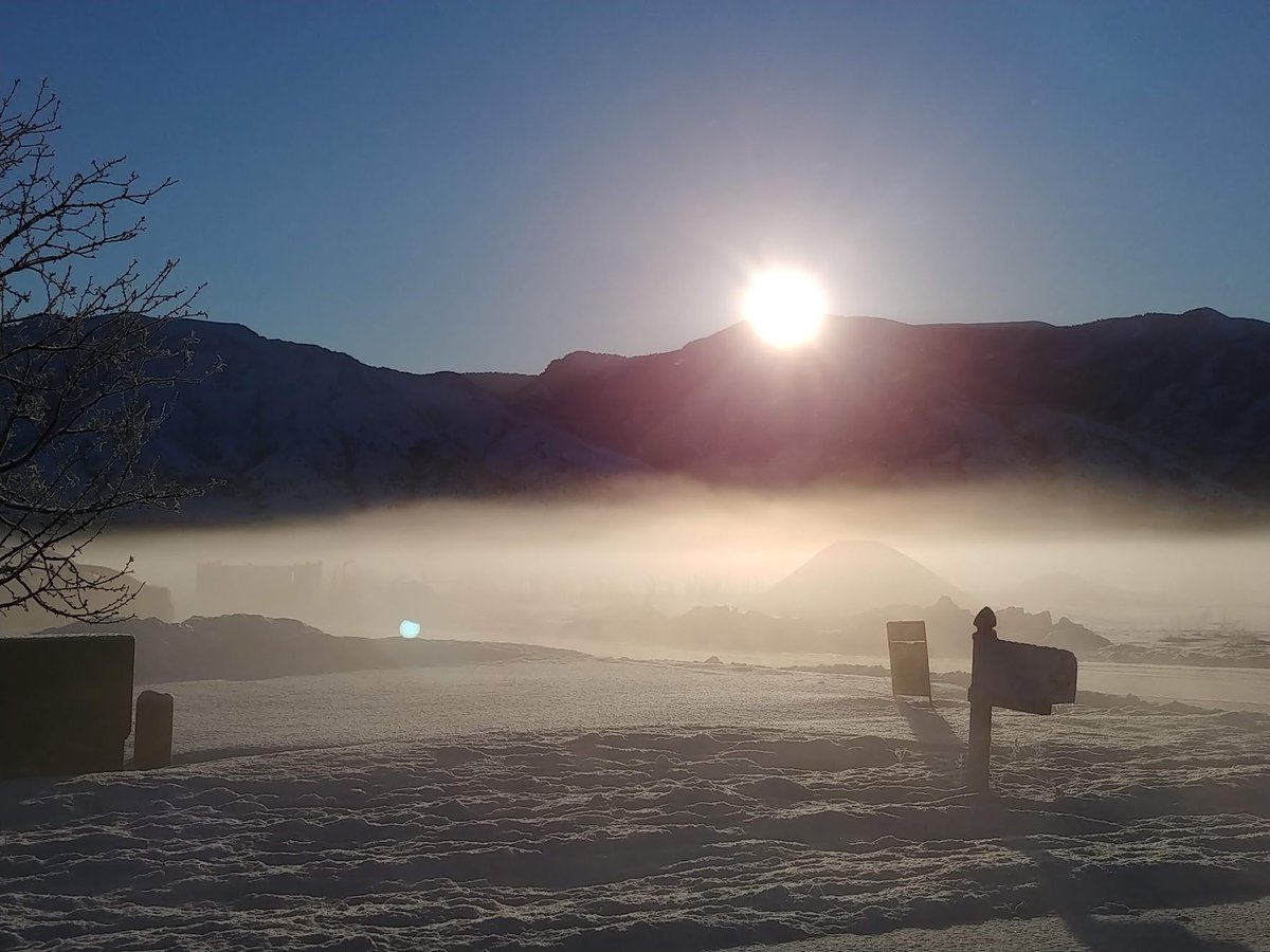 Icy radiation fog only about 6' (2m) deep seen in the Cache Valley of Utah just after sunrise . Temperature as low as -4F (-20C) as I drove through it.