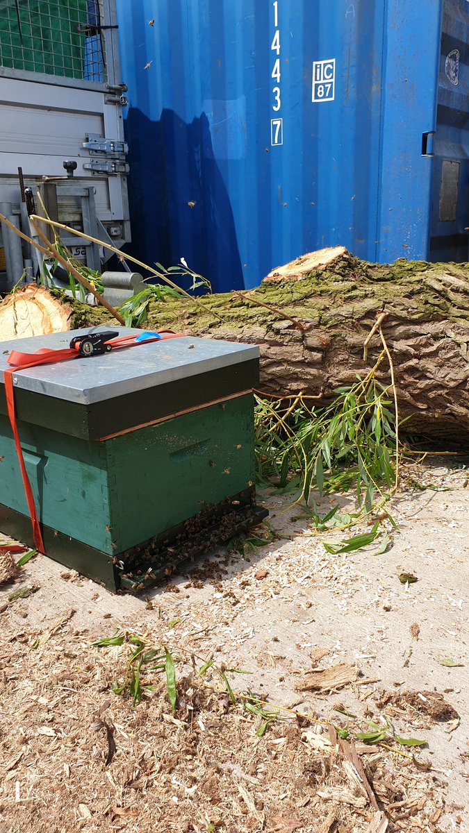 Boomverzorgingsbedrijf en imker stellen bijenvolk uit omgewaaide boom in Hoofddorp veilig. Intussen staat boomstam in Heemstede. Met de bijen gaat het goed!
