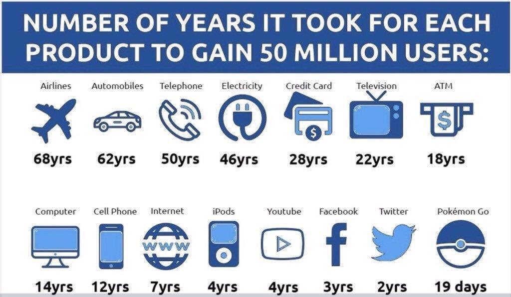 Number of years it took for each product to gain 50 Million users