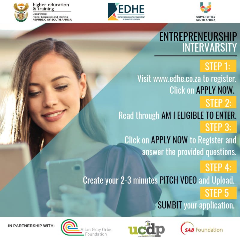 #StudentEntrepreneur 60k for your winning biz idea! Entrepreneurship Intervarsity applications close 30 April. Hit APPLY on the (link: https://edhe.co.za ) http://edhe.co.za homepage#EDHEintervarsity#SEW2019@uctgsbsolutions@FabAcademicpic.twitter.com/REpna2Ph70