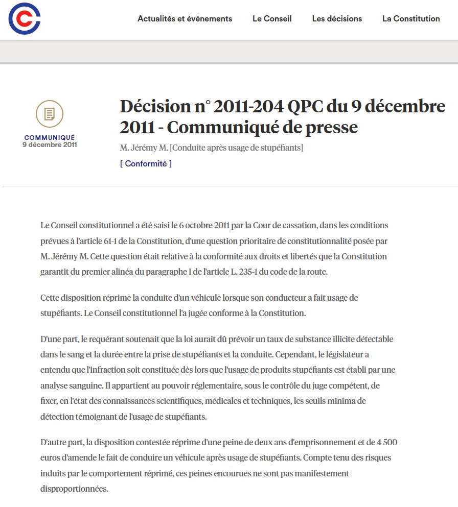 #stupéfiants La loi ne prévoit pas un taux de substance illicite détectable dans le sang, ni la durée entre prise de stupéfiants et conduite. Le Conseil constitutionnel a jugé l'art L.235-1 du CR conforme à la Constitution. → https://www.conseil-constitutionnel.fr/decision/2011/2011204QPC.htm …pic.twitter.com/WeC1MmwhgX