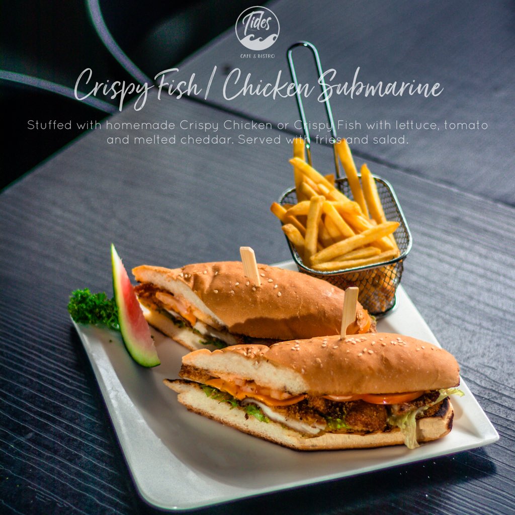 Choose between crispy fish or chicken for this delicious submarine made with tomato, melted cheddar, served with fries and salad.