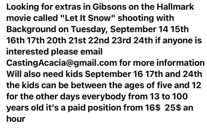 CASTING CALL: Background performers and extra talent for Let It Snow Hallmark Movie filming in Gibsons on Sunshine Coast BC Canada from September 14 to September 28
