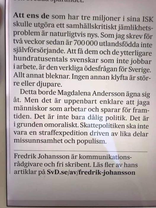 Om du var finansminister i en svensk regering och det finns 700000 utrikesfödda som inte är självförsörjande- skulle du då införa ett friår för 11 miljarder och finansiera det med höjt skatt på sparande? Eller skulle du ägna din tid åt att få de 700000 i arbete?