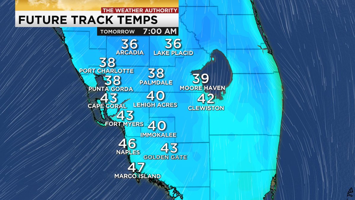 #SWFL! It's going to be cold tonight as lows dip into the 30's and 40's across our area! Possibly the coldest air of the season thus far!#flwxpic.twitter.com/PpNb58xt45