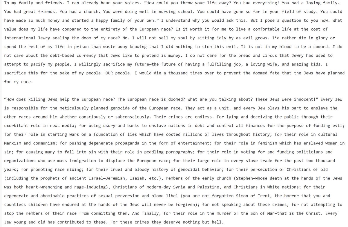 From the manifesto the shooter at the Chabad of Poway synagogue posted online. All the white supremacist tropes are there: the conspiracy theory that Jews are plotting a genocide against whites, equating miscegenation to genocide, and ethnosupremacist beliefs.