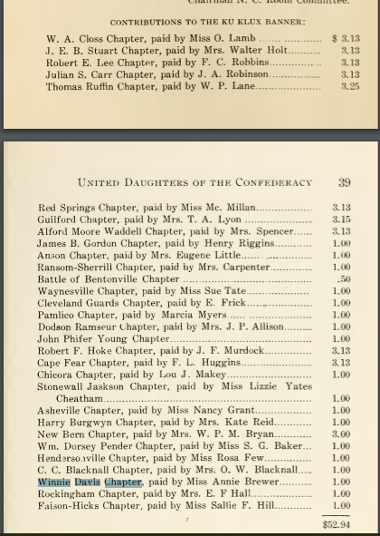 The confederate trophy in Pittsboro (Chatham Cty) was sponsored by and bears the name of the Winnie Davis Chapter of the UDC in 1907. The year prior, that same UDC chapter helped purchase a KKK banner for a museum in Richmond, as recorded in 1906 convention minutes.