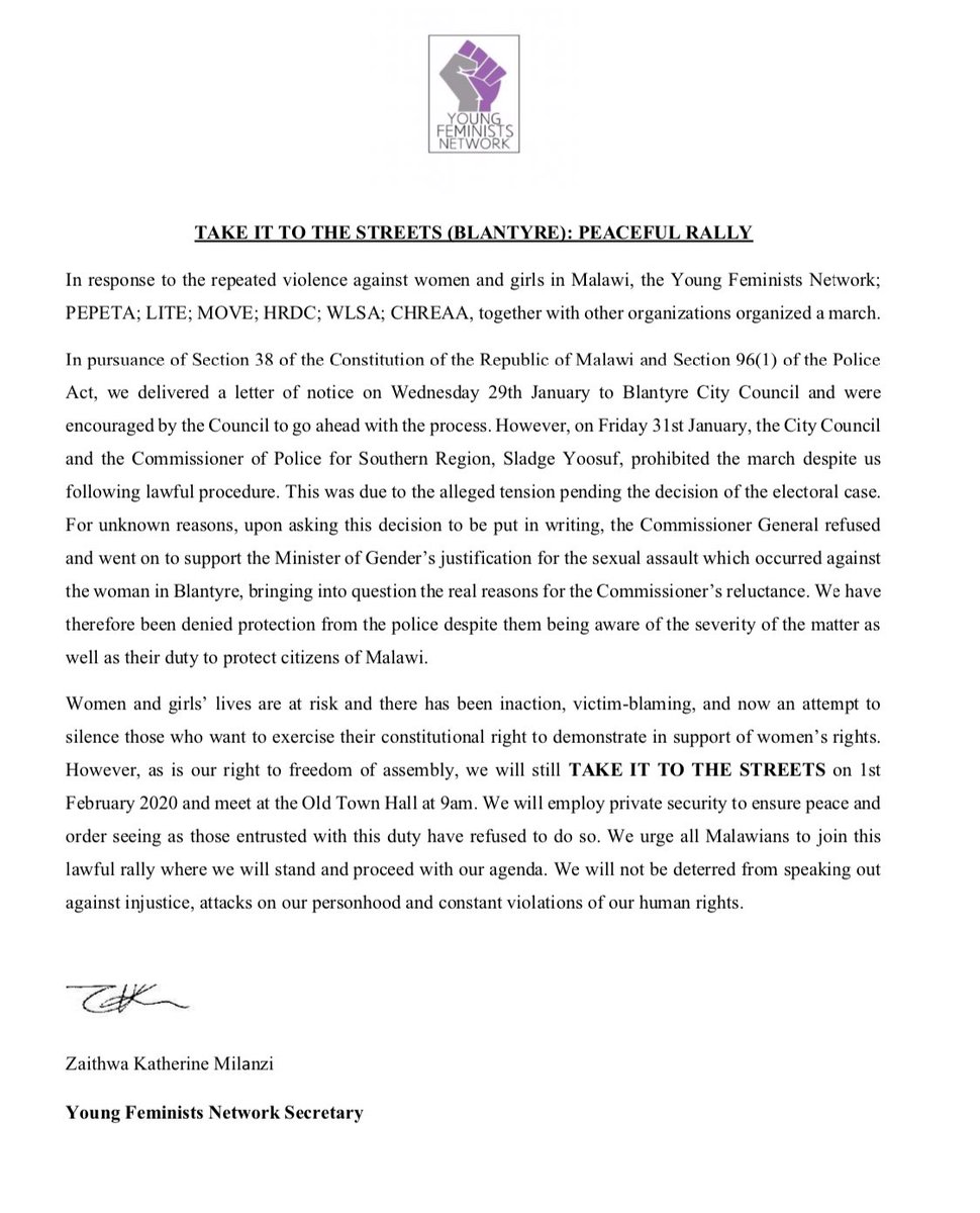 Despite us following lawful procedure, Blantyre City Council has today prohibited us from marching in Blantyre. However, tomorrow BLANTYRE is still going to #TakeItToTheStreets