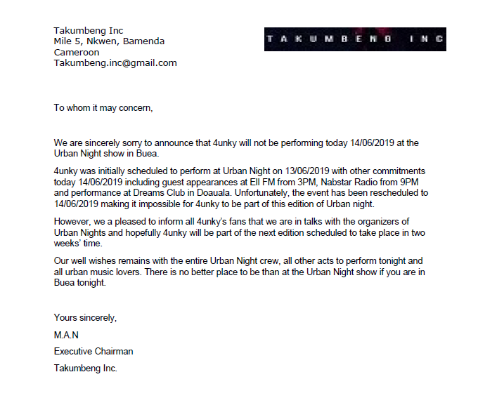 #Takumbengmovement, We are sorry to announce that I will not be with you in Buea tonight for reasons mentioned in the attached write up. pic.twitter.com/Gy27vN9U6f