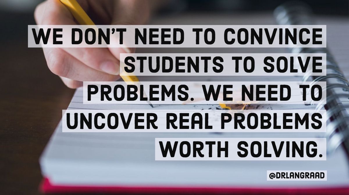 @drlangraad: We don’t need to convince students to solve problems. We need to uncover real problems worth solving.#ThursdayThoughts#education#teaching#edchat pic.twitter.com/tFZ8xFEE4Lpic.twitter.com/8B3cKOTTsB
