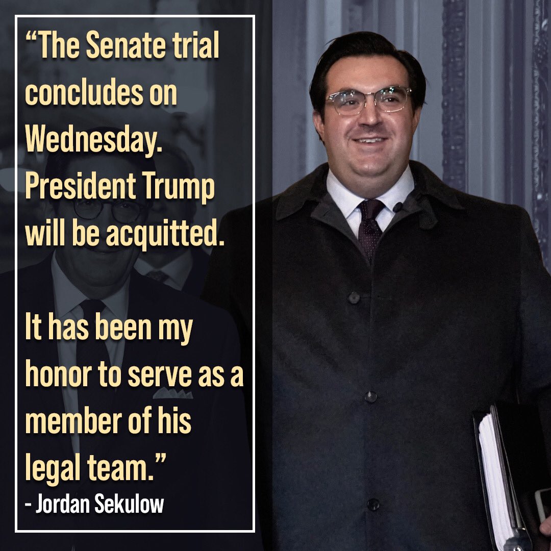 @JordanSekulow for an awesome job from the whole team!!!#teamwork#ImpeachmentClosing#AquittedForeverhttps://twitter.com/jordansekulow/status/1224450391397421061 …