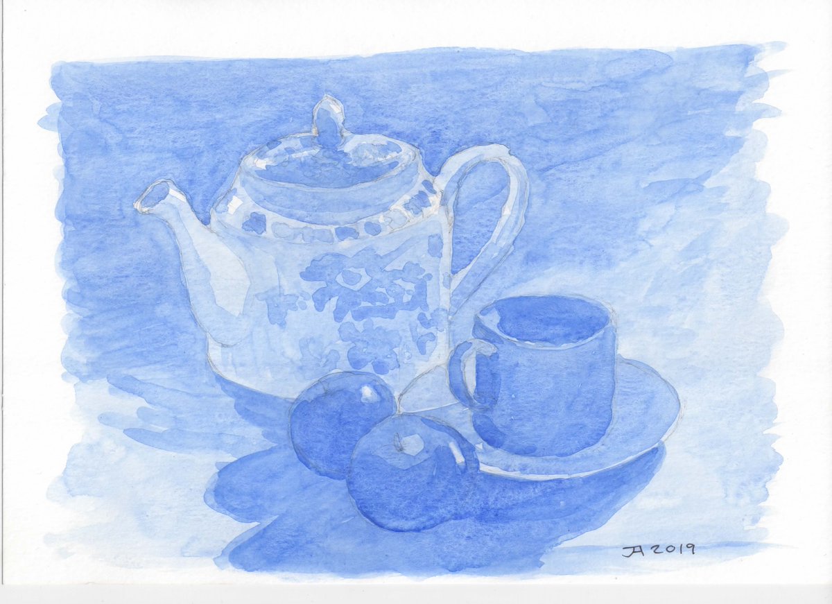 #watercolour exercise:#stilllife of a#teapot, plums, and cup & saucer. (300 gsm Cass Art smooth watercolour paper) pic.twitter.com/byt42U8FfQ