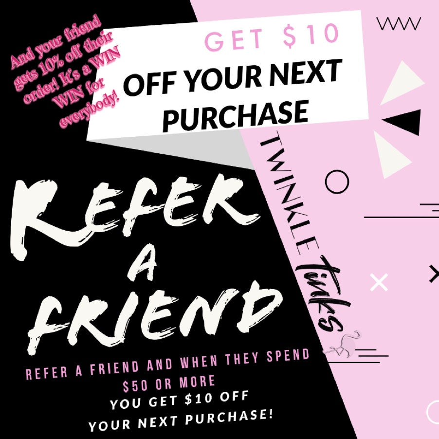 All you have to do is refer a friend when they spend $50 ( before tax )or more with Tinks you get $10 OFF your next purchase! Your friend will also receive 10% OFF their purchase! It’s a WIN WIN for everyone!