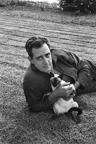 Raymond Burr and his pal. Such a versatile actor from the angry, dark film noir characters to the brilliant empathetic Perry Mason.