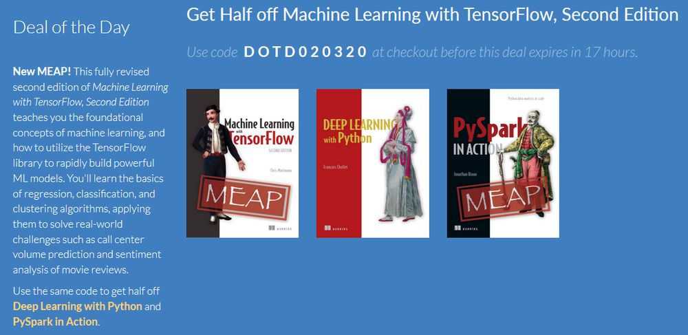 Last call on DOTD Feb 3: Half off Machine Learning with TensorFlow, Second Edition! Use code dotd020320tw at http://bit.ly/38W1BPl