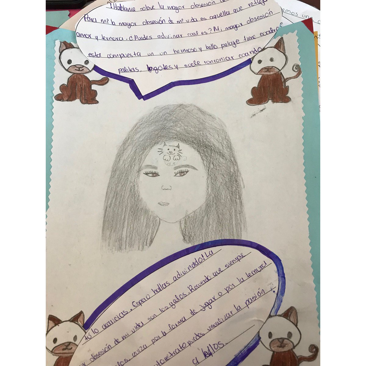 My SSS1 students created self-portraits inspired by Frida Kahlo, then they explained what is on their forehead (what they are currently obsessed with.)