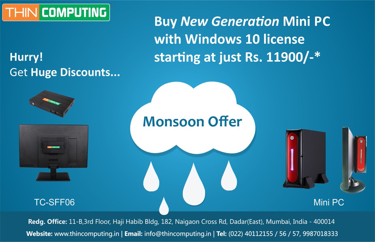 #Monsoon#Offer! Grab Huge#Discounts on purchase of Thin Client Devices. Buy new gen#thinclients & enjoy plenty of irresistible benefits. http://www.thincomputing.in | info@thincomputing.in Contact: (+91) 022 24112134 / 55, 9819902155 | 9987018333pic.twitter.com/Yl53jF2dnT