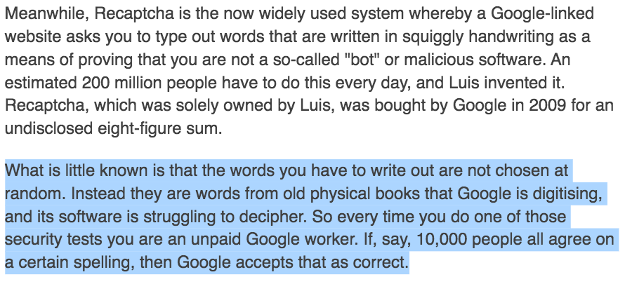Had no idea that the Recaptcha system is used by Google to verify the digitalisation of physical copies of old books. Really smart way of using small actions from millions of people to accomplish this mammoth task.