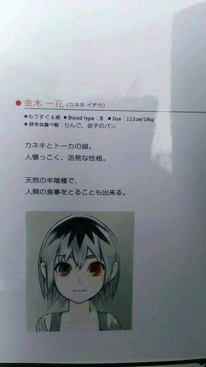 • Ichika Kaneki (The kanji used in her name is "one" and "flower") • Will be soon 6 years old • Blood type B • Size: 112cm/18kg • Favorite foods: apples, Yoriko's bread • Friendly, has a lively personality • She's a natural half-ghoul