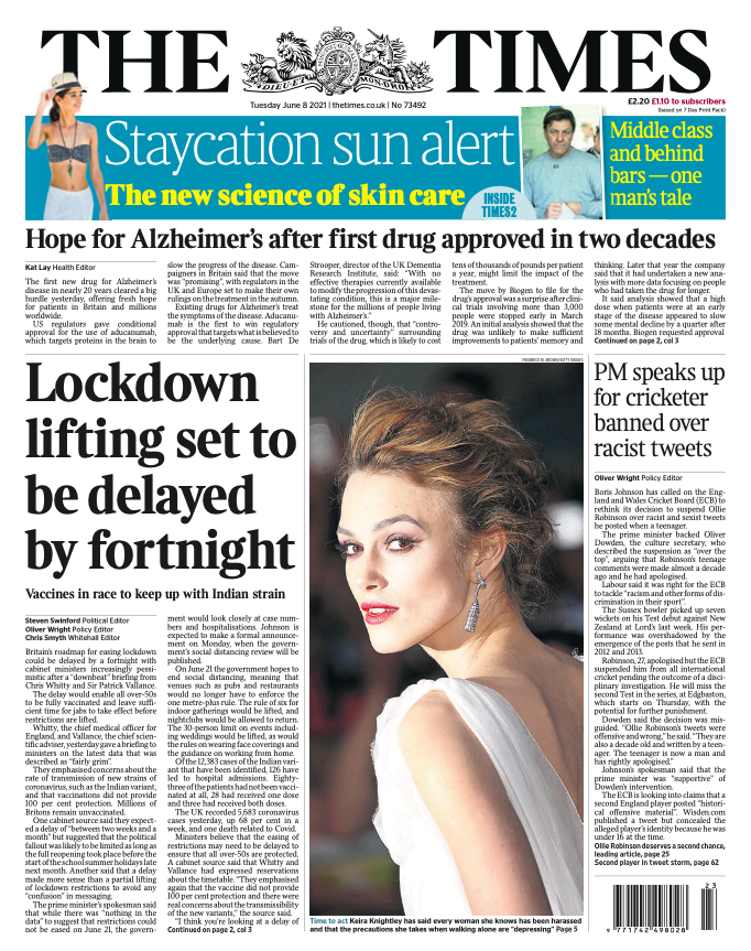 Tuesday’s Times: “Lockdown lifting set to be delayed by fortnight"