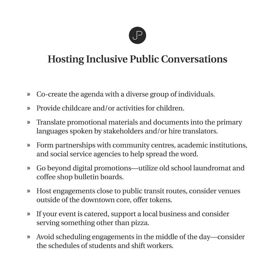 A group focused on the city’s capacity & future hosted a meeting that excluded many voices. Here are suggestions for making public conversations & consultations inclusive. It’s pretty comprehensive but definitely in-progress. I welcome additional insights. Thoughts?