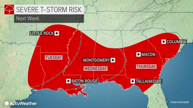 #tornadoes and severe thunderstorms Monday through Wednesday of next week. Details attached. https://twitter.com/breakingweather/status/1223402337315717120 …