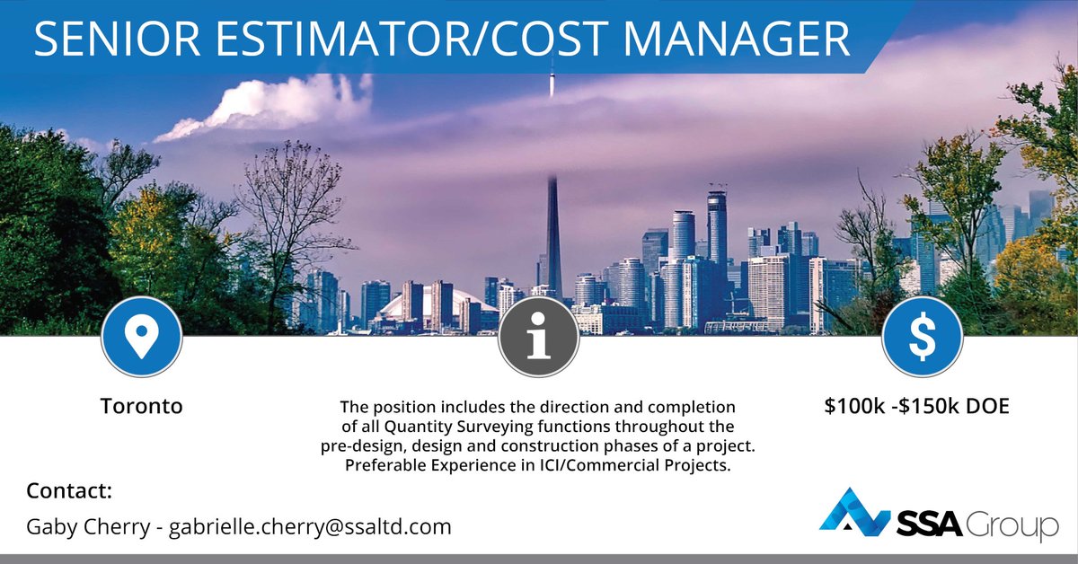 NOW HIRING: SENIOR ESTIMATOR / COST MANAGER - TORONTO Salary: $100k -$150k DOE. Includes direction & completion of all QS functions. Preferable Exp in ICI/Commercial Projects. Contact: gabrielle.cherry@ssaltd.com