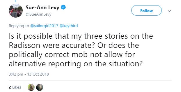 Since poor little Sue-Ann Levy blocked me, this is the best I can do! Alternative reporting?? No Sue-Ann it is not possible your 3 stories were accurate & NO we do not allow " alternative reporting" we call that lying. The new Kelly-Ann Conway of the North?